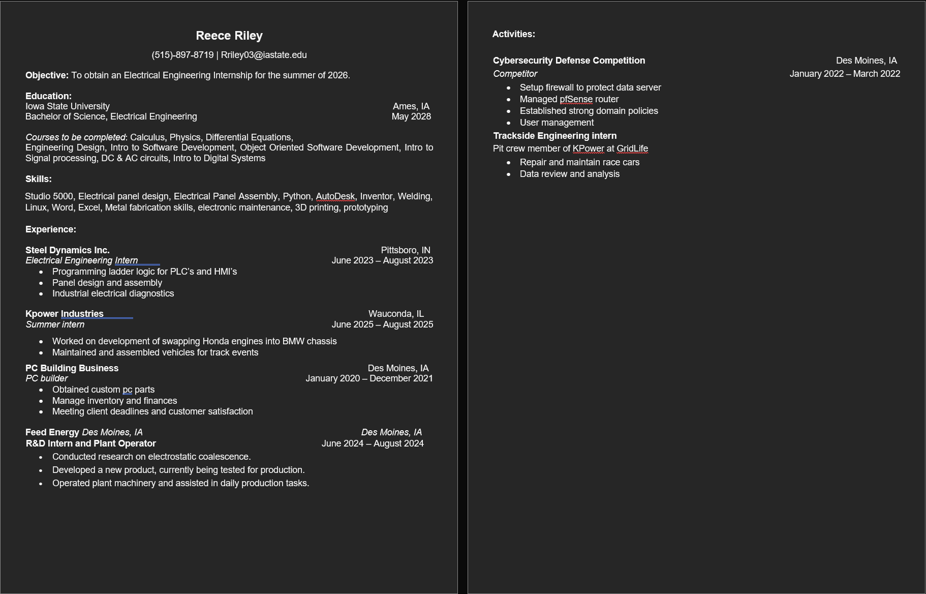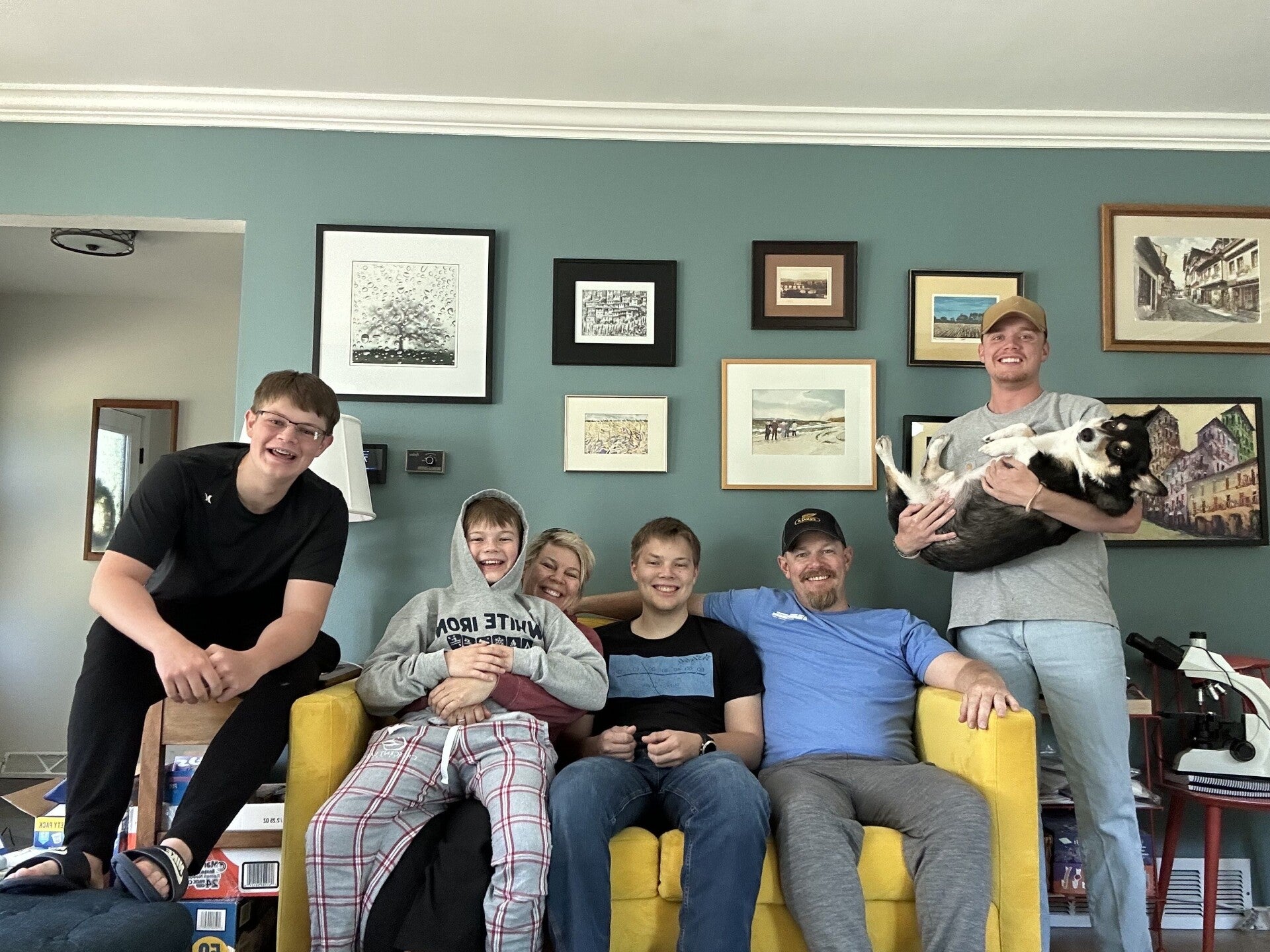 Hi, my name is Reece Jacob Riley. I am pursuing electrical engineering at Iowa State University and hope to work in the automotive industry after graduation. I love spending time with my family and working on cars. In the picture on the right-hand side, from left to right, we have Whitaker, Norman, my mother, Sarah, me, my father, Joseph, my older brother, Josh, and his dog, Herman.